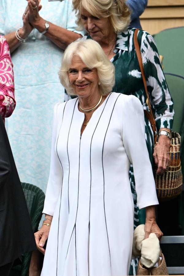 最近,在上周出现在温布尔登时,卡米拉女王似乎选择了她最典型的服装和轮廓之一——一件装饰着黑色条纹滚边的白色长束腰连衣裙。